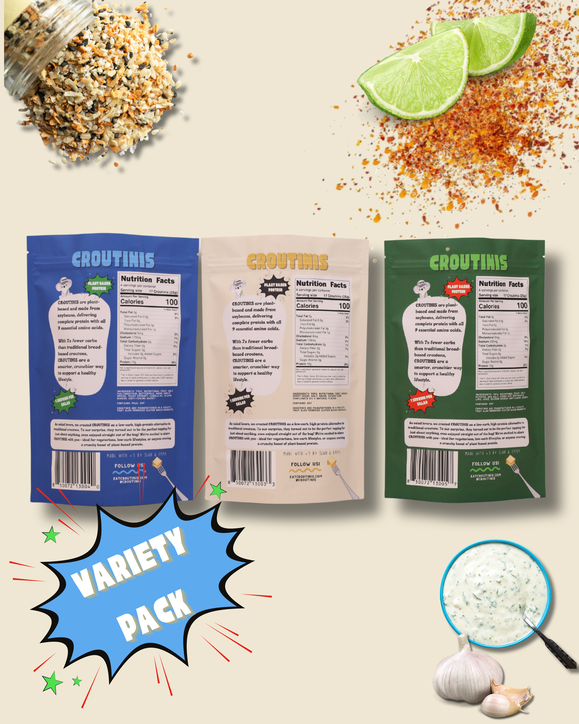 Enjoy all three of our fantastic Croutini Flavors (Everything Bagel, Chili Lime, and Ranch) and determine which is your favorite!